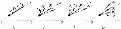 4.如图所示,小车上固定着三角硬杆,杆的端点固定着一个质量为m的小球.当小车有水平向右的加速度且逐渐增大时,杆对小球的作用力的变化(用F1至F4变化表示)可能是下图中的(OO'沿杆方向) ( )