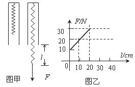 某同学在研究性学习中,利用所学的知识解决了如下问题:一轻弹簧竖直悬挂于某一深度为h=25.0cm,且开口向下的小筒中(没有外力作用时弹簧的下部分位于筒内,但测力计可以同弹簧的下端接触),如图(甲)所示,如果本实验的长度测量工具只能测量出筒的下端弹簧的长度l,现要测出弹簧的原长l0和弹簧的劲度系数,该同学通过改变l而测出对应的弹力F,作出F-