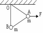 13.(10分)两个相同的小球A和B,质量均为m,用长度相同的两根细线把A、B两球悬挂在水平天花板上的同一点O,并用长度相同的细线连接A、B两小球,然后,用一水平方向的力F作用在小球A上,此时三根细线均处于直线状态,且OB细线恰好处于竖直方向,如图所示。如果不考虑小球的大小,两小球均处于静止状态,则