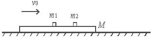 16.(12分)如图所示,质量为M=2kg的长木板上表面光滑,与水平地面的动摩擦因数为μ=0.2,在板上放有两个小物块,可看作质点,左边的小物块质量为m1=1.5kg,距木板左端s1=8m,右边的小物块质量为m2=0.5kg,与m1相距s2=4m。现敲击木板左端使其瞬间获得以10m/s向右的初速度,求: