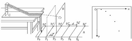 。把覆盖复写纸的白纸铺贴在硬板B上。实验时依次将B板插入A板的各插槽中,每次让小球从斜轨的一同位置由静止释放。每打完一点后,把B板插入后一槽中并同时向纸面内侧平移距离
