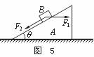 7. 如图 5 所示,斜劈 A 静止放置在水平地面上。质量为 m 的物体B在外力 F1 和 F2 的共同作用下沿斜劈表面向下运动,当F1 方向水平向右,F2 方向沿斜劈的表面向下时,斜劈受到地面的摩擦力方向向左,则下列说法中正确的是( )