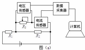 25.(22分)如图所示,R1、R2为定值电阻,R3为滑动变阻器。3个电阻采用如图(a)方式接在电源上,已知R1=3Ω、R2=12Ω。现利用电压传感器(相当于电压表)和电流传感器(相当于电流表)研究R3上的电压与电流变化关系,任意滑动R3上的滑片,通过数据采集器将电压与电流信号输入计算机后,在屏幕上得到的U-I图像为如图(b)所示的一条直线(实线部分)。试求: