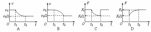 9.汽车在平直公路上以速度v0匀速行驶,发动机功率为P,牵引力为F0。t1时刻,司机减小了油门,使汽车的功率立即减小一半,并保持该功率继续行驶,到t2时刻,汽车又恢复了匀速直线运动(设整个过程中汽车所受的阻力不变)。下面几个关于汽车牵引力F、汽车速度v在这个过程中随时间t变化的图像中正确的是
