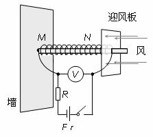 ,工作时总是正对着风吹来的方向。电路的一端与迎风板相连,另一端在M点与金属杆相连。迎风板可在金属杆上滑动,且与金属杆接触良好。定值电阻R=1.0Ω,电源的电动势E=12V,内阻r=0.5Ω。闭合开关,没有风吹时,弹簧处于原长,电压表的示数U2=3.0V,某时刻由于风吹迎风板,电压表的示数变为U2=2.0V。(电压表可看作理想表)求: