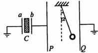 5.如图所示,C为中间插有电介质的电容器,a和b为其两极板;a板接地;P和Q为两竖直放置的平行金属板,在两板间用绝缘线悬挂一带电小球;P板与b板用导线相连,Q板接地。开始时悬线静止在竖直方向,在b板带电后,悬线偏转了角度α。现取出a、b两极板间的电介质,则下列说法中正确的是: