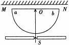 9.如图所示,MN是位于竖直平面内的光屏,放在水平面上的半圆柱形玻璃砖的平面部分ab与屏平行。由光源S发出的一束白光从半圆沿半径射入玻璃砖,通过圆心O再射到屏上.在水平面内以O点为圆心沿逆时针方向缓缓转动玻璃砖,在光屏上出现了彩色光带.当玻璃砖转动角度大于某一值,屏上彩色光带中的某种颜色的色光首先消失。有关彩色的排列顺序和最先消失的色光是 ( )