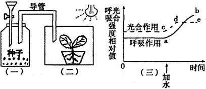 2. 某同学为研究某些环境因素对光合作用和呼吸作用的影响,设计了下面密闭的实验装置(一)、(二)。由漏斗向种子瓶内加入少量水后,测定的种子呼吸作用强度和植株光合作用强度变化曲线如下图(三)所示。据图分析,可以得出: