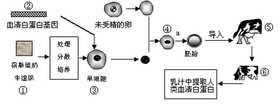 30.(24分)人的血清白蛋白(HSA)在临床上需求量很大,通常从人血中提取。但由于艾滋病病毒(HIV)等人类感染性病原体造成的威胁与日俱增,使人们对血液制品顾虑重重。应用基因工程和克隆技术,将人的血清白蛋白基因转入奶牛细胞中,利用牛的乳汁生产血清白蛋白,既提高了产量,又有了安全保障。下图是利用奶牛乳汁生产人类血清白蛋白的图解,根据下图回答: