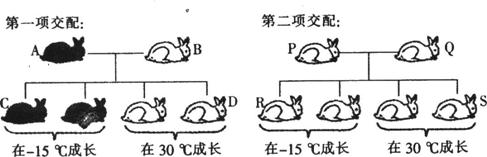Ⅱ、在某类动物中,毛色黑色与白色是一对相对性状。黑色为显性(W),白色为隐性(w)。下图示两项交配,亲代动物A、B、P、Q均为纯合子,子代动物在不同环境下成长,其毛色如下图所示,请据图分析回答: