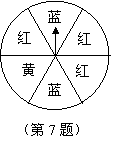 7、如图,一个可以自由转动的转盘被等分成6个扇形区域,并涂上了相应的颜色,转动转盘,转盘停止后,指针指向黄色区域的概率是( )