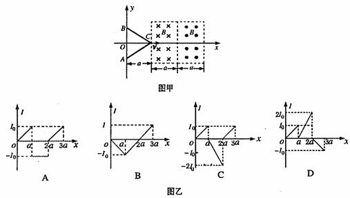 2.如图甲所示,两个垂直纸面的匀强磁场方向相反,磁感应强度的大小均为B,磁场区域的宽度均为a,一正三角形(高度为a)导线框ABC从图示位置沿图示方向匀速穿过两磁场区域,以逆时针方向为电流的正方向,在图乙中感应电流I与线框移动距离x的关系图象正确的是( )