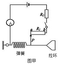 8、为锻炼身体,小明利用所学物理知识设计了一个电子拉力计,图甲是原理图。硬质弹簧右端和金属滑片P固定在一起(弹簧的电阻不计,P与R1间的摩擦不计)。定值电阻R0=5Ω,a、b是一根长为