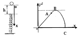 2、 如图所示,劲度系数为k的轻弹簧竖直放置,下端固定在水平地面上,一质量为m的小球,从离弹簧上端高h处自由释放,压上弹簧后继续向下运动的过程中。若以小球开始下落的位置的原点,沿竖直向下建一坐标轴ox,则小球的速度平方v2随坐标x的变化图象如图所示,其中OA段为直线,AB段是与OA相切于A点的曲线,BC是平滑的曲线,则A、B、C各点对应的位置坐标及加速度,以下说法正确的是(C)