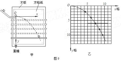 15、某同学在“研究平抛物体的运动” 的实验中,在已经判定平抛运动在竖直方向为自由落体运动后,再来用图9甲所示实验装置研究水平方向的运动。他先调整斜槽轨道槽口末端水平,然后在方格纸(甲图中未画出方格)上建立好直角坐标系xOy,将方格纸上的坐标原点O与轨道槽口末端重合,Oy轴与重垂线重合,Ox轴水平。实验中使小球每次都从斜槽同一高度由静止滚下,经过一段水平轨道后抛出。依次均匀下移水平挡板的位置,分别得到小球在挡板上的落点,并在方格纸上标出相应的点迹,再用平滑曲线将方格纸上的点迹连成小球的运动轨迹如图9乙所示。已知方格边长为L,重力加速度为g。