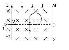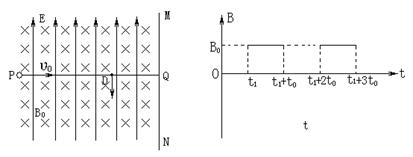 19、(14分)如图所示,与纸面垂直的竖直面MN的左侧空间中存在竖直向上场强大小为E的匀强电场(上、下及左侧无界).一个质量为m、电量为q=mg/E的可视为质点的带正电小球,在t=0时刻以大小为V0的水平初速度向右通过电场中的一点P,当t=t1时刻在电场所在空间中加上一如图所示随时间周期性变化的磁场,使得小球能竖直向下通过D点,D为电场中小球初速度方向上的一点,PD间距为L,D到竖直面MN的距离DQ为L/π.设磁感应强度垂直纸面向里为正.