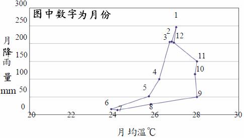 读某地多年平均月降水量及月均温分布图。回答3-5题。![]()