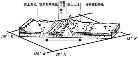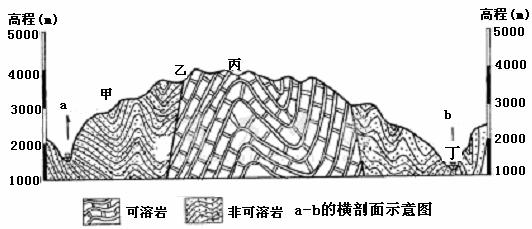 (1)甲处的地质构造是 , 乙处的地质构造是 ,随着时间的发展,丙处以后有可能形成________地貌,其原因是______________________;丁地的地貌是 ,其形成原因是 。(14分)
