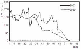 读山东省2003年与2030年人口年龄结构比较图,完成3―5题。