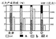 下图显示我国东部四个省(市)2005年三大产业构成及GDP值,读图回答6-8题。