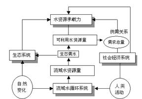 下图为“区域(流域)量化水资源承载力的系统关系示意图”,结合此图回答16-17题。