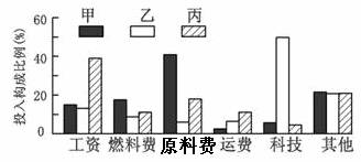 下图中甲、乙、丙反映了三类工厂的投入构成情况,据此回答19―20题