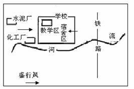 22.某中学研究性学习小组考察了该校附近的地理环境,并绘制了学校周边的简易地理图(如右图)。该小组在考察时发现,学校附近的工厂尚未对污染进行治理。请你结合示意图帮他们完善研究成果(共10分)