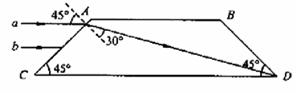 (2)图5表示两面平行玻璃砖的截面图,一束平行于CD边的单色光入射到AC界面上,a、b是其中的两条平行光线。光线a在玻璃砖中的光路已给出。画出光线B从玻璃砖中管次出射的光路图,并标出出射光线与界面法线夹角的度数。