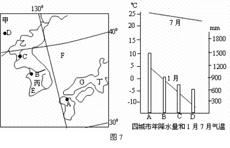 (3) 图中A→D四城市气温年较差和年降水量变化规律是什么?简述这两种变化规律的形成原因。(14分)