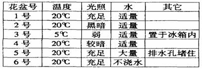 5. 将一个刚出芽的马铃薯块茎切成大小大致相同的6块,每块均带有芽眼。取6个同样大小、质地相同的花盆,分别装满同样的泥土,将每块分别埋于6个花盆的泥土中5cm深处,按下表要求连续管理培植20天。有关该实验的叙述中,错误的是( )