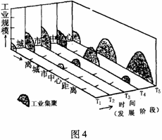 6.图4为“某城市工业集聚规模随时间变化示意图”。符合该城市工业分布和规模变化规律的是( )