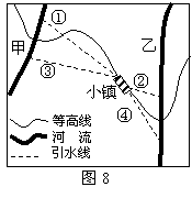 21.图中两条小河的流量相当。进入小镇的引水线最合理的是