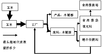 木糖醇生产后产生的下脚料――木糖渣若堆放在田地或土坑中,因木糖渣很轻,在干旱季节,容易造成严重的空气污染和水污染。但利用木糖渣代替棉籽壳做食用菌袋的填充料,可发展食用菌种植。现当地已形成几个食用菌栽培大乡(镇)。但光靠栽培食用菌还不能消耗所有的木糖渣,当地企业又开发了用晒干的木糖渣代替燃煤技术,3吨干渣就能代替一吨煤,给企业节省了大量成本。