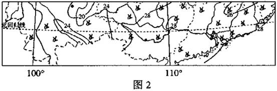 读我国某区域糖料作物分布示意图(图2),图中等值线为等温线,回答7~9题。
