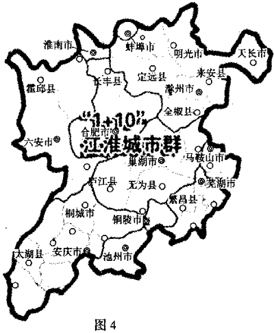 安徽省将在统筹协调好省会经济圈、皖江城市带、沿淮城市群发展的基础上,逐步构筑以合肥为中心的“1+10”江淮城市群。读江淮城市群城市分布示意图(图4),回答12~14题。