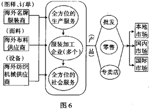 18.根据某服装生产专业镇工业联系示意图(图6),对该镇服装产业特点的叙述,不正确的是