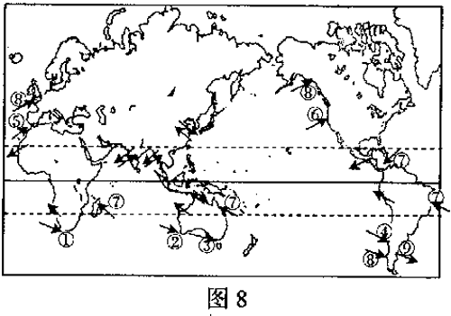 读全球离岸风和迎岸风分布示意图(罔8),回答下列问题。