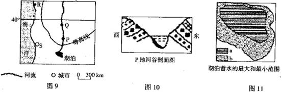 图9为某区域示意图,图10反映图9中的P地河谷剖面,P地河谷剖面的形成与地转偏向力的作用有关,图1l反映图9对应的湖泊情况。回答下列问题。