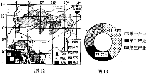 尼日利亚是非洲人口最多的围家,人口文盲率达46.7%。图12是尼日利亚简图,图13是尼日利亚产业构成图,回答下列问题。