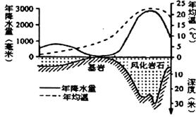 图为“不同气候区岩石的风化深度与当地年均温及年降水量的关系示意图”。读图回答7-8题。