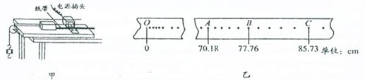 (2)如图甲所示,某同学将一端固定有滑轮的长木板水平放置在桌沿上,利用钩码通过细线水平拉木块,让木块从静止开始运动。利用打点计时器在纸带上记录下的木块运动情况如图乙所示,其中O点为纸带上记录到的第一点,A、B、C是该同学在纸带上所取的计数点,图乙所标明的数据为A、B、C各点到O点的距离。已知打点计时器所用交流电源频率f=50Hz(以下的计算结果均要求保留两位有效数字)