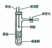(II)将铁丝浸入盐酸,反应放出氢气,待试管内空气排尽后,向上提拉铁丝,使铁丝脱离液面。并关闭弹簧夹;用另一根细铁丝沿玻璃管内将钠粒捣入液体中。