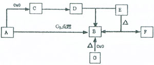 A是生活中最常见的有机物,该化合物的蒸气对氢气的相对密度是23,是生物燃料之一。C的溶液能发生银镜反应,反应后的溶液经酸化可得D。G为单质,其原子最外层电子数为次外层的2倍。F中阴阳离子个数比为l:l,其阳离子与Ar具有相同的电子层结构(注:CuO与G反应生成B;E加热分解生成B和F;部分反应条件、反应物、生成物略去:A―F的转化关系如右上图)。