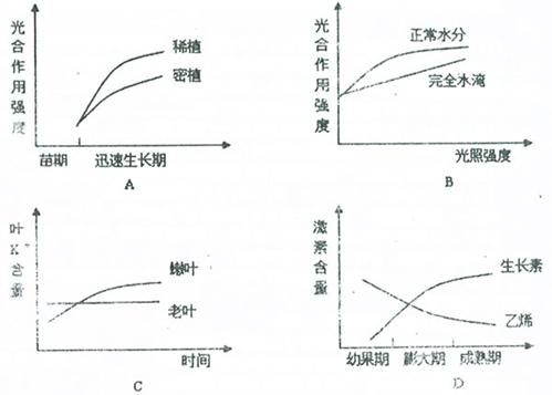 (2)下列4幅图中,若图A表示番茄植株在不同种植密度下光合作用强度的变化,图B表示两组番茄植株分别在正常和水淹条件下培养时光合作用强度的变化,图C表示生长正常的番茄植株移栽到缺钾营养液中培养后叶K+含量的变化,图D表示番茄果实形成过程中激素含量的变化。则其中不正确的是 。
