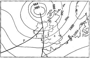 读8月份中纬度某地区海平面等压线图,回答下面三题。