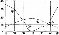 图中的两条曲线表示地理事物或现象随纬度的变化,图中纵坐标的单位依各相关要素而定。读图回答下面两题。