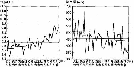 图是我国华北地区1954~2002年气温与降水变化示意图,完成下面两题。