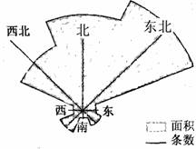 图为“祁连山冰川朝向玫瑰图”,它是把祁连山总的冰川条数和面积分成100份,把其中4份作为一个长度和面积单位,按不同的方向绘制。读图回答下面两题。