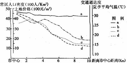 图为我国长江三角洲地区某城市人口密度、土地价格、交通通达度、夏季平均气温变化图,读图完成下面两题。