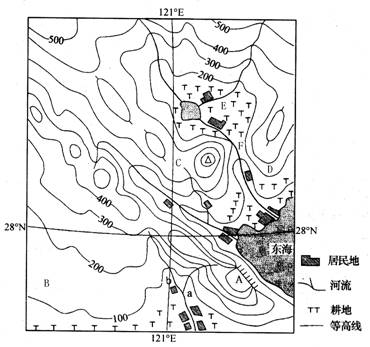 (3)该地区计划建一小型水库,从图中条件分析,大坝建在何处较合适? ___ _ __ (用字母表示)水库的建设中会带来___ ___等负面影响。(3分)